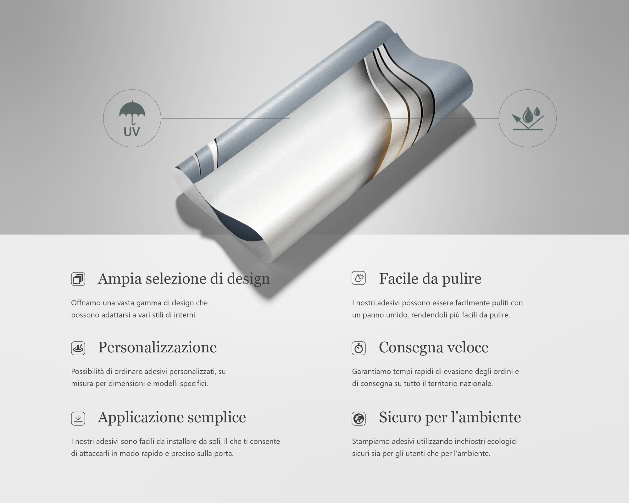 - Durata e usura: Elevata resistenza all'abrasione per mantenere i colori e i dettagli del motivo anche in presenza di uso frequente della porta.