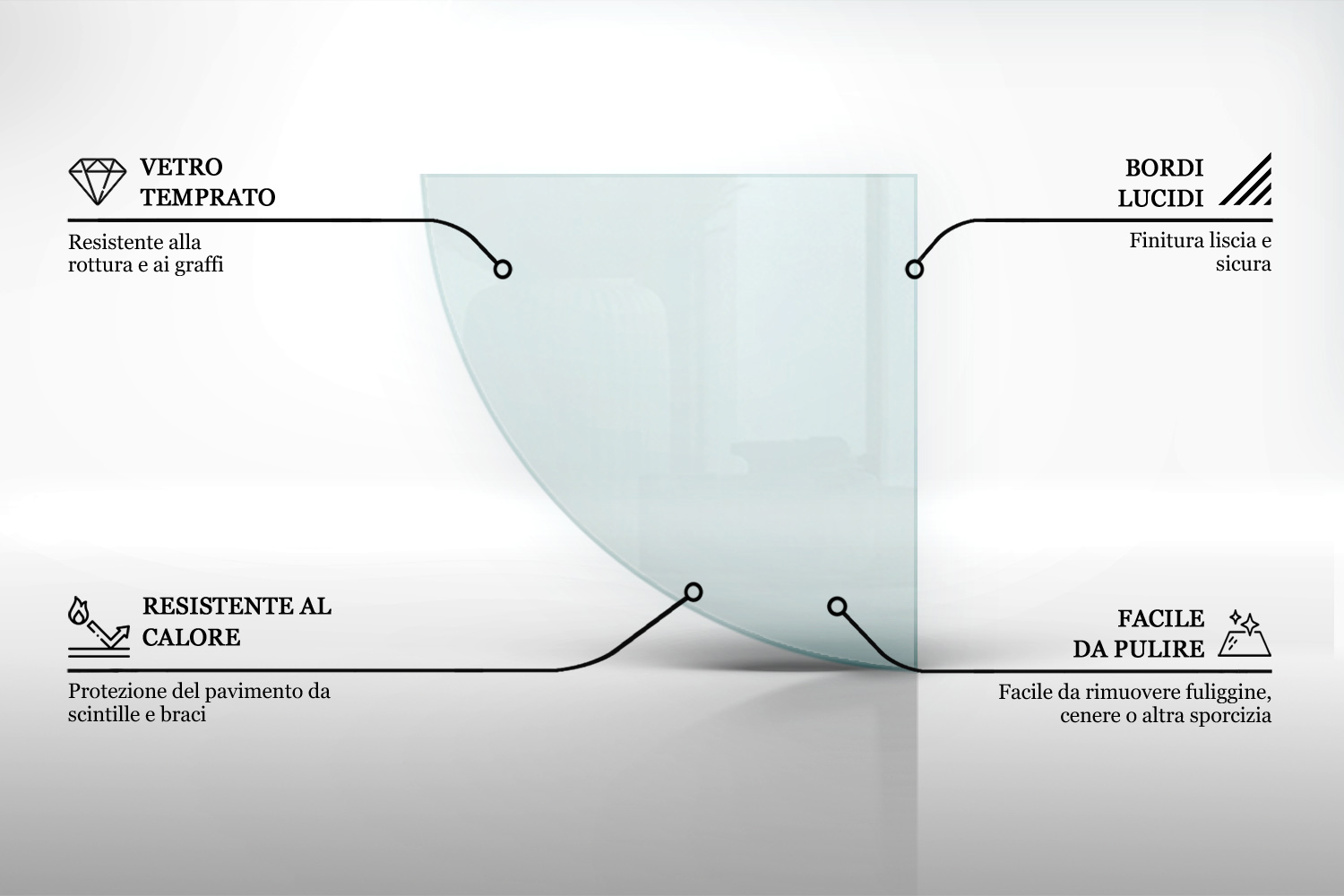 Lastra in vetro per caminetto a quarto di cerchio trasparente è una lastra temperata sagomata a quarto di cerchio che propone un'estetica essenziale e luminosa. La superficie lucida e liscia esalta la trasmissione della luce creando un effetto di leggerezza visiva attorno alla base del camino o della stufa. Il bordo levigato e la pulizia ottica del vetro trasmettono una sensazione tattile di finitura raffinata e moderna, ideale per chi cerca un elemento discreto ma definito sotto il dispositivo di riscaldamento.