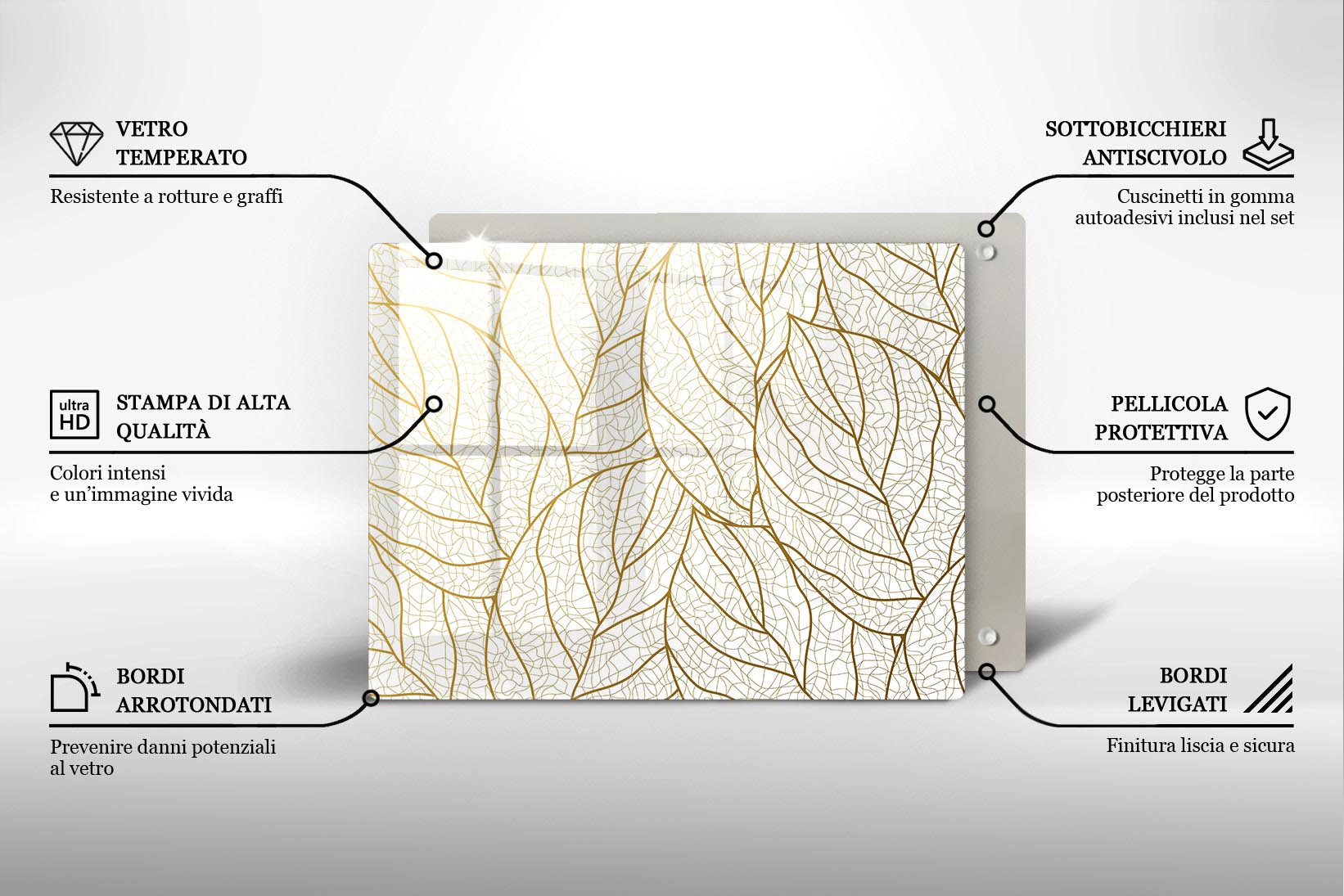 - Materiale resistente: Realizzato in acrilico colato trasparente (PMMA) con stampa sullo strato inferiore, offre un aspetto simile al vetro ma con maggiore resistenza agli urti e alla rottura.