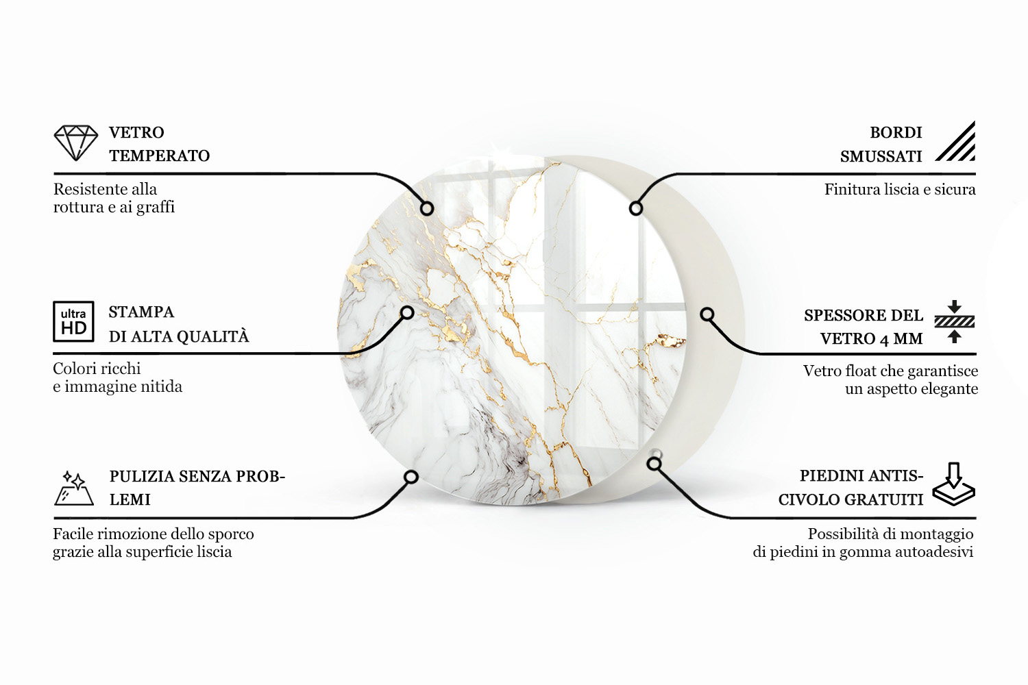 - Materiale resistente: Vetro temperato che garantisce maggiore robustezza rispetto al vetro non trattato e una sicurezza migliorata in caso di sollecitazioni.